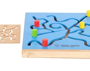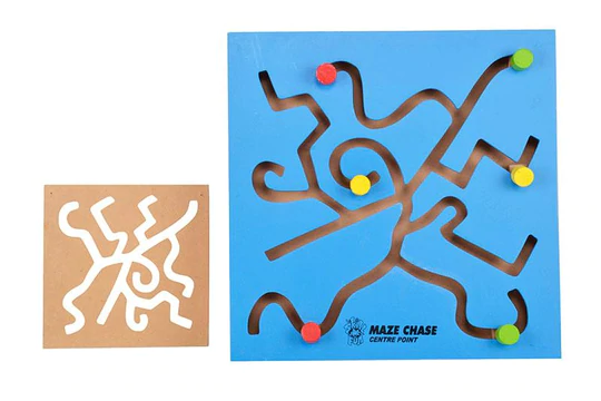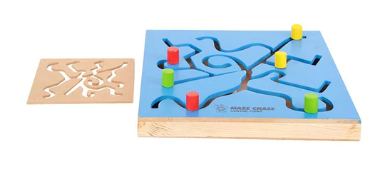 A pre-cursor to teaching skills, this is very important for a young child. The movement of the wrist and hand muscles when the child moves the wooden cube cross the path is the same as is required and used by the child when he/she starts to write. This is a great way for a child to exercise and condition his/her wrist movement, fingers, and hand movement. And he’s just playing! Also provided is a wooden stencil that can be used to trace patterns of paper. Create designs using different colored dots and have the child copy them on the Maze Chase boar
