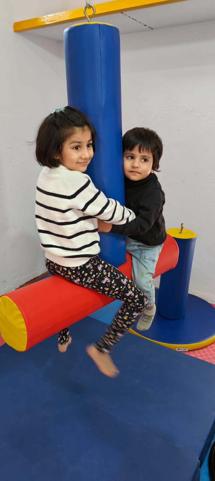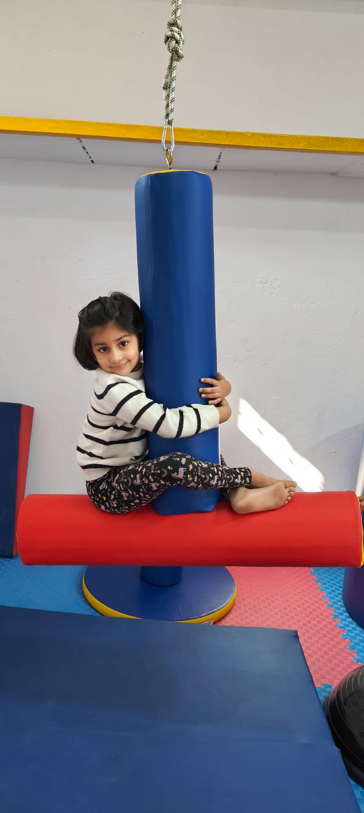 The T swing is one of our kids’ favorite swings! This T-shaped foam therapy swing creates a secure and exciting sense of play.it provides both vestibular and proprioceptive stimulation Vary the vestibular input from gentle pushing and rocking to more active shaking, rotating, and orbiting.